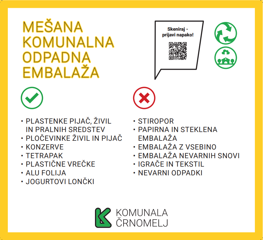 V zabojnik za mešano komunalno odpadno embalažo NE SODI: (zabojnik z rumenim pokrovom)