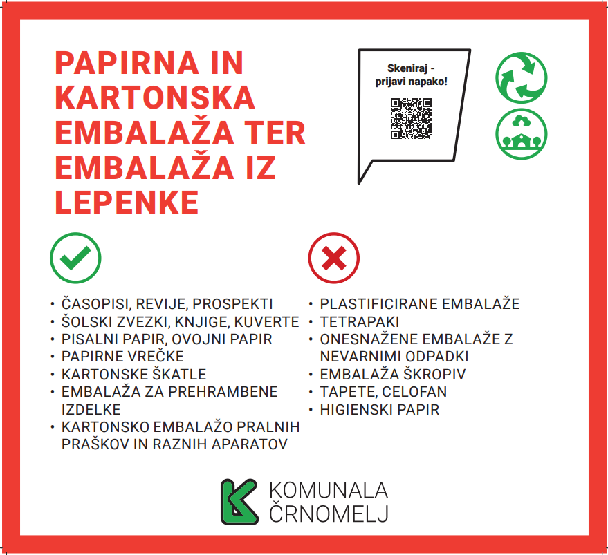 V zabojnik za papirno in kartonsko embalažo ter embalažo iz lepenke NE SODI: (zabojnik z rdečim pokrovom)