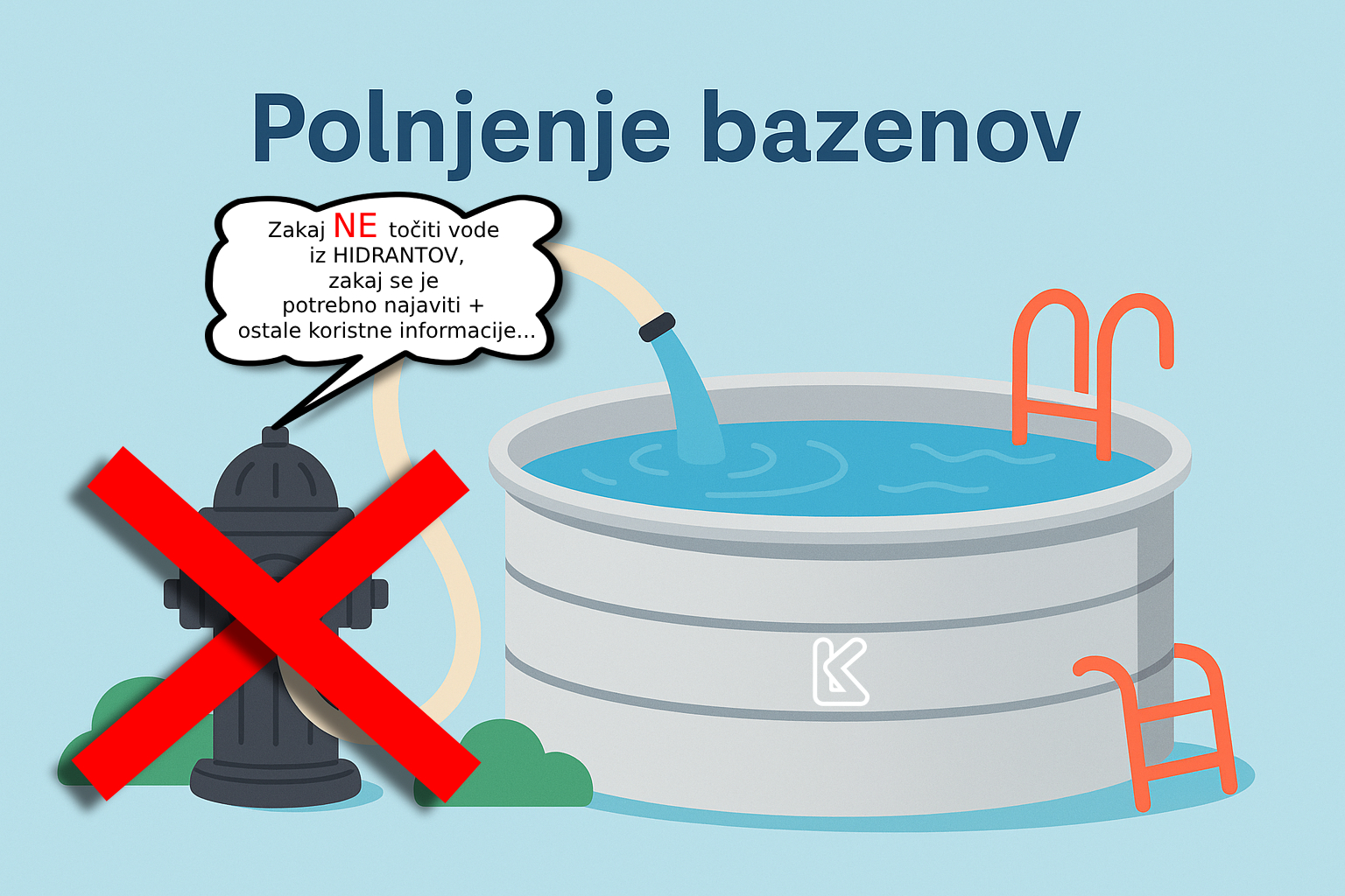 Najbolj enostavno in tudi najbolj pravilno je, da uporabniki polnijo bazene iz interne vodovodne napeljave. Zato svetujemo uporabnikom, da pred in po polnjenju bazena popišejo stanje vodomera in nam te podatke sporočijo (tel. 07 30 61 660 ali sprejemna.pisarna@komunala-crnomelj.si). Na ta način bo strošek vode za polnjenje bazena v celoti na naslednji položnici, akontacije za naprej pa bodo ostale nespremenjene. Ne glede na akontacije in obračune potrebujemo, da uporabniki najavijo povečano trenutno porabo vnaprej (𝐯𝐬𝐚𝐣 𝟐 𝐝𝐧𝐢 𝐩𝐫𝐞𝐝 𝐩𝐨𝐥𝐧𝐣𝐞𝐧𝐣𝐞𝐦 𝐛𝐚𝐳𝐞𝐧𝐚).