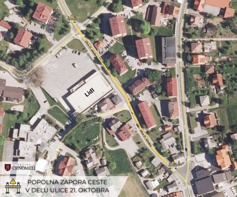 Obvestilo o popolni zapori ceste v delu ulice 21. oktobra. Popolna zapora ceste bo od ponedeljka, 16. 9. 2024 do sobote, 26. 10. 2024. V času izvajanja del bo prišlo do občasnih motenj oskrbe s pitno vodo v Ulici 21. oktobra in v Ulici pod smreko. Prosimo vas za razumevanje in potrpežljivost v času del.